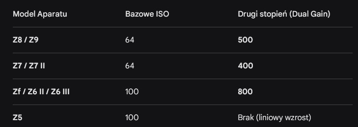 Nikon Z9, podobnie jak większość nowoczesnych aparatów, wykorzystuje technologię Dual Gain ISO. Choć w różnych systemach stosuje się inne nazewnictwo (np. Dual Native ISO czy Dual Conversion Gain), zasada działania pozostaje ta sama.